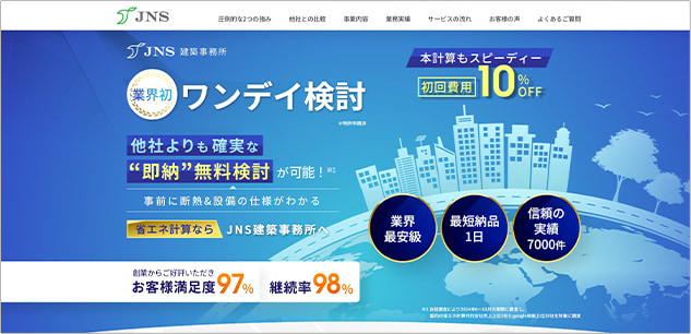 JNS建築事務所なら、業界最安級の料金&最短1日納品で、省エネ計算をプロがスピーディー&確実に代行!